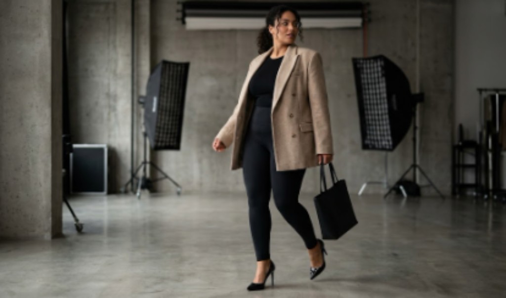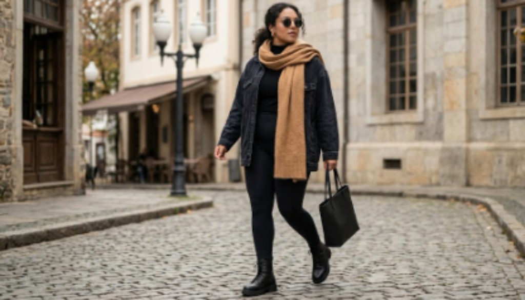 O jogo de proporções equilibra o visual: a peça ampla em cima traz sofisticação, enquanto a legging destaca as pernas de forma elegante e equilibrada.