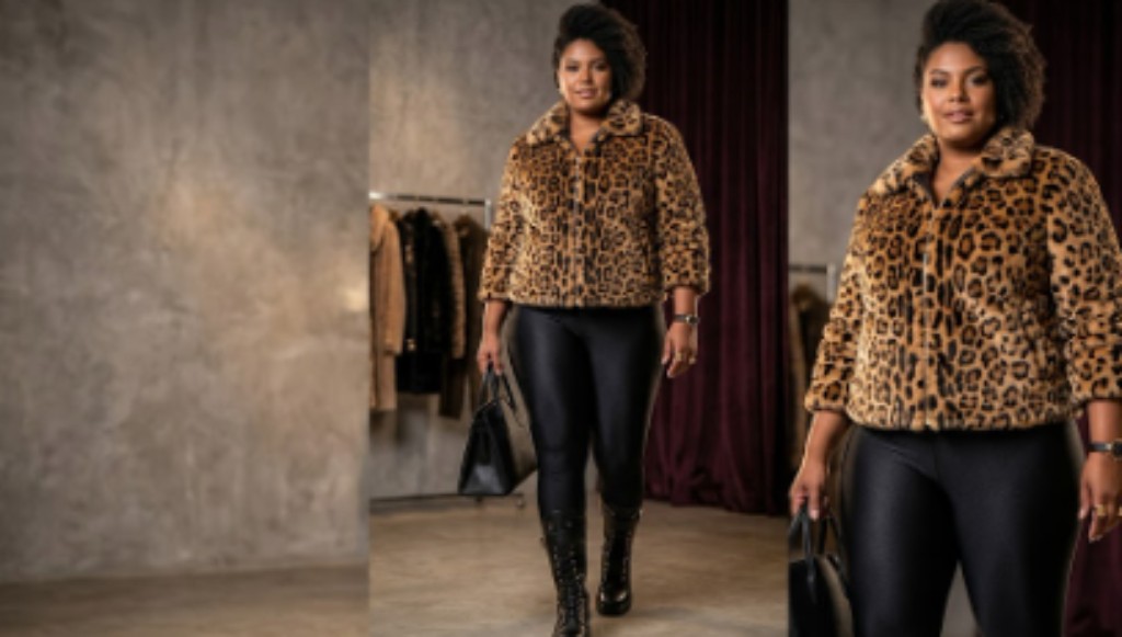 O luxo é percebido instantaneamente através do contraste sensorial entre o ajuste seco da legging e o volume sofisticado da textura de onça, equilibrando força e feminilidade.